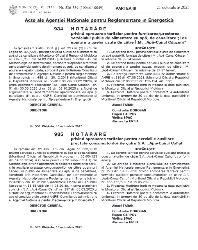 Conform hotărîrei Agenţiei Naţionale pentru Reglementare în Energetică a Republicii Moldova privind aprobarea tarifelor pentru furnizarea/prestarea serviciului public de alimentare cu apă, de canalizare și de epurare a apelor uzate, nr. 586 din 15 octombrie 2025 sunt modificate tarifele la serviciul de alimentare cu apă: